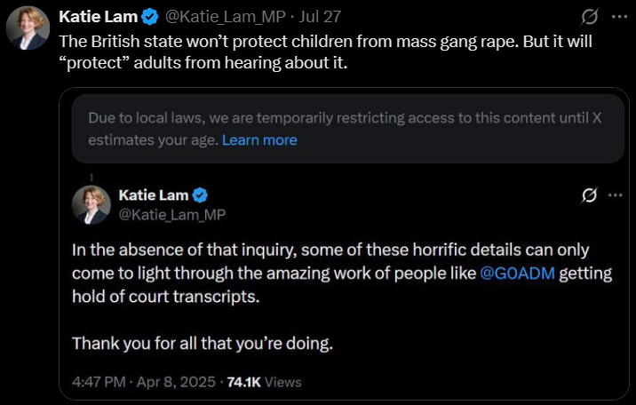 This age gated censorship has hit any media around protests in the UK and anything reported on lack of investigation by the government into "mass rape gangs". The Labour government plans to allow 16 and 17 year olds vote in the next election, benefitting them as young voters tend to swing more left. However, due to their age they won't be able to consume any of this type of political media, leaving them going to the polls not fully informed of the political landscape in the UK.